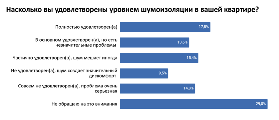Еще 15% опрошенных россиян удовлетворены акустической средой в квартире частично, а 24% имеют значительные претензии к степени защиты от постороннего шума. 29% настолько привыкли к разным звукам, что уже не обращают на них внимания.
